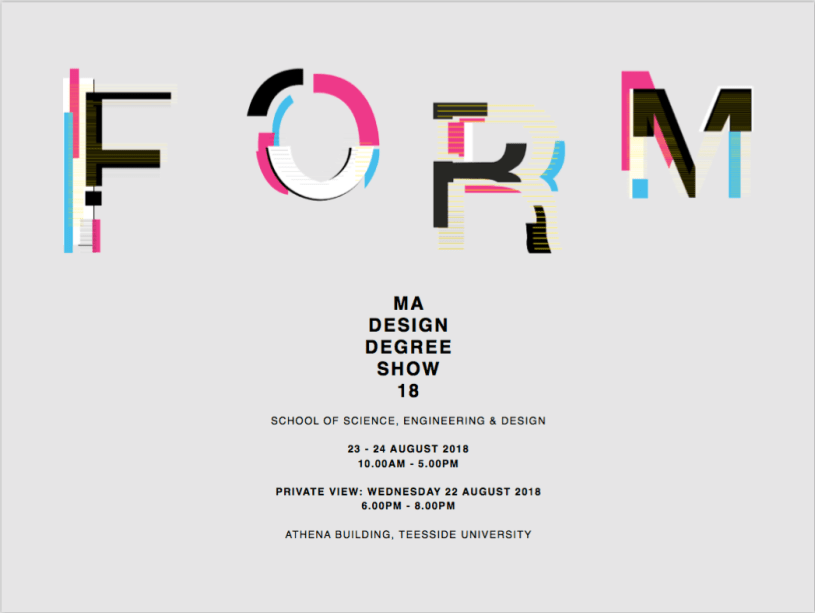 Here is an invitation to the final display of work by MA Future Design and MA Digital Arts & Design students at Teesside University, 2018.