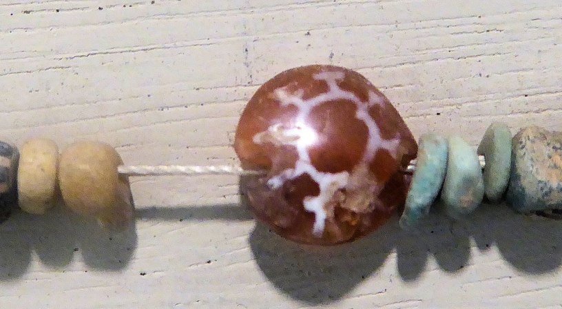 Dyspepsia gazed at the beads with the eye of a scientist, marvelling at the workmanship. She wanted to work out how they did it. They didn’t have grinders or electric motors, or power tools of any sort (except tools powered by little boys jumping up and down on pedals connected to the workbench with pulleys and rods). Clever people who have studied these things think they must have taken a thin stick and dipped it in gritty powder and then just sat twiddling it to make the hole in each tiny bead.