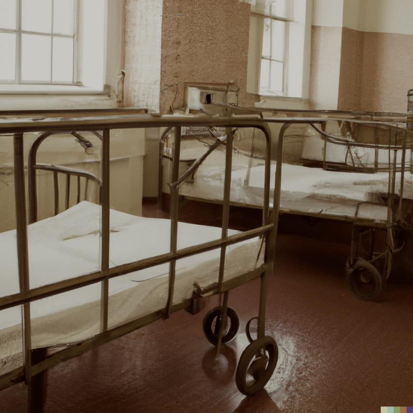She closed the door and the iron bar fell with a clank. Now they were in a dim stairwell of bare concrete steps. Turning right they found themselves in a room full of heavy steel cots, from which countless years and innumerable teeth had nibbled away much of the enamel.