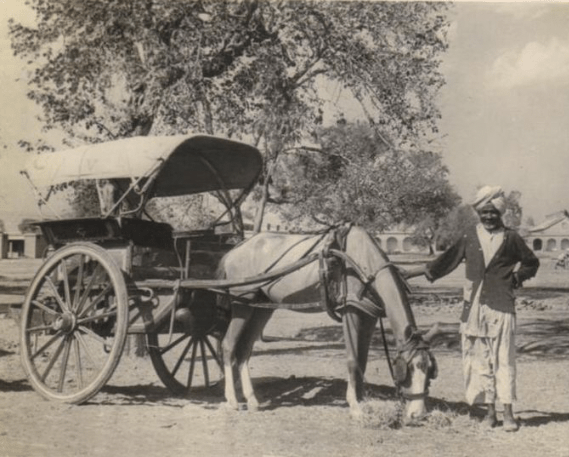 The one that came was a far superior conveyance to the one we’d had the night before, chosen as the latter had been by the fighting prowess of the driver rather than by its appearance. It balanced itself on two huge rubber-tyred wheels, sported a stripy canopy and announced its arrival through a bell hung round the neck of the Arab steed. Assisted by the tonga-wallah Abdul soon had boxes numbered 1 and 2 aboard and off we set for the residential quarter.