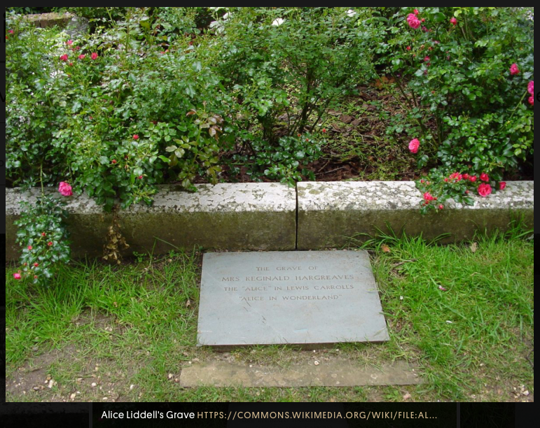 The grave of Alice Pleasance Hargreaves (née Liddell) in Lyndhurst, Hampshire, a town in the middle of Britain’s historic New Forest.