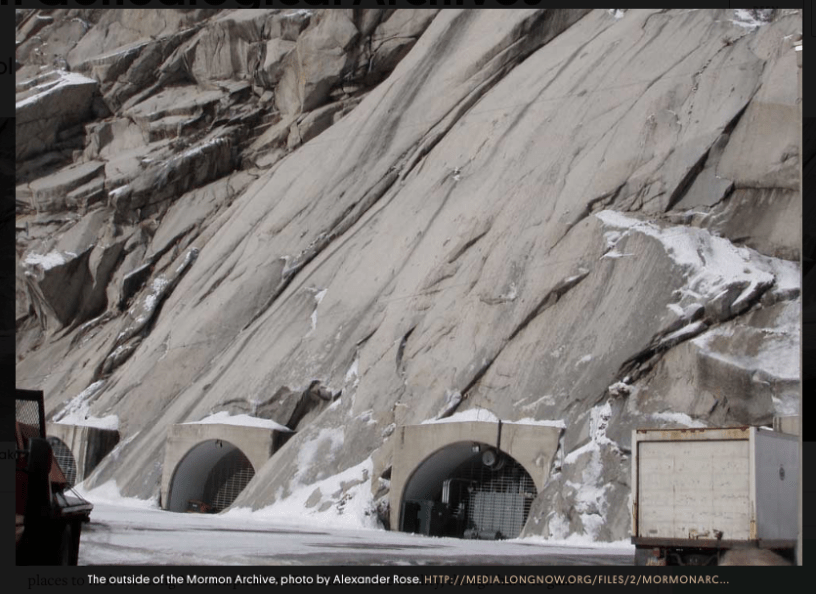 It is no surprise therefore that the Mormon church (more precisely the LDS Church) has a deep interest in preserving genealogical records for centuries against all anticipated threats. The Mormon Genealogical Archives are stored in an underground bunker deep in the solid granite cliffs of Little Cottonwood Canyon, outside Salt Lake City, Utah. Its design makes heavy use of Long Now thinking about how best to preserve written and digital records.
