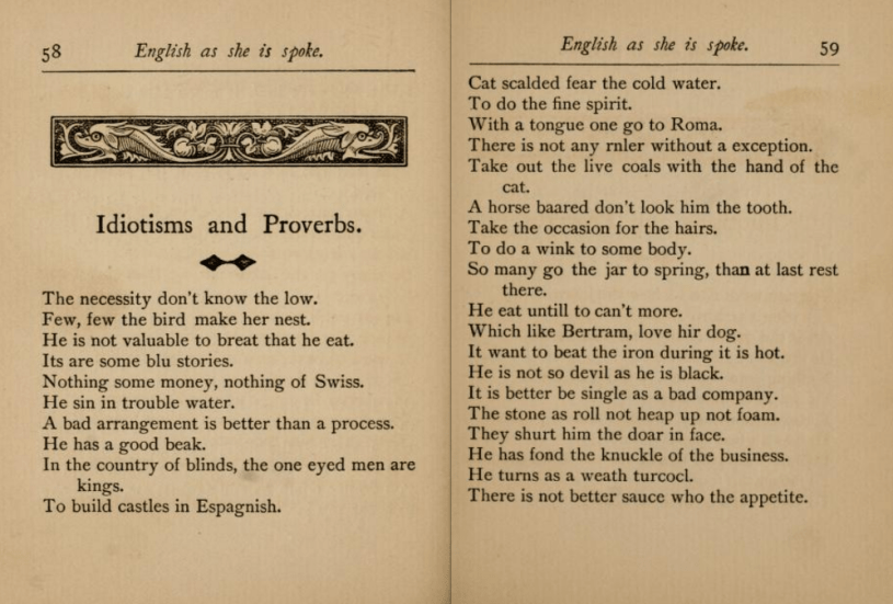 Uncategorized English As She is Spoke Date: 31/03/2024Author: whitbywriters 0 Comments An 1883 Portugese-to-English phrasebook, by a well-meaning gentleman who couldn’t speak English. Share this: Click to share on X (Opens in new window) X Click to share on Facebook (Opens in new window) Facebook Like Loading... Related