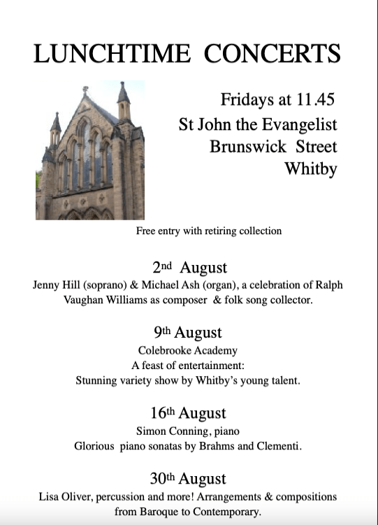 Uncategorized Lunchtime Concerts Date: 21/07/2024Author: whitbywriters 0 Comments The August 2024 programme of entertainments at St John’s Church, Brunswick Street, Whitby. Share this: Click to share on X (Opens in new window) X Click to share on Facebook (Opens in new window) Facebook Like Loading... Related