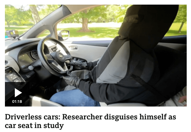Uncategorized Driverless? Really? Date: 29/07/2024Author: whitbywriters 0 Comments Q: How do you investigate people’s responses to driverless cars? A: How about disguising yourself as a car seat? Share this: Click to share on X (Opens in new window) X Click to share on Facebook (Opens in new window) Facebook Like Loading... Related