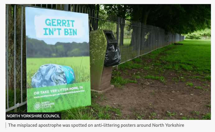 Only they’re not random, according to the Yorkshire Dialect Society, one of the oldest such bodies (established 1897). And once again North Yorkshire Council has been taken to task for its haphazard apostrophisation, needing to replace hundreds of posters put up at tourist spots with the correct phrase, which happens to be: