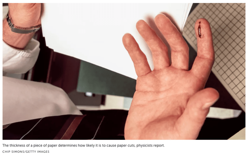 Physicists have discovered that paper 65 microns thick is the most likely to deliver those notoriously nasty cuts – roughly that used by magazines and scientific journals.
