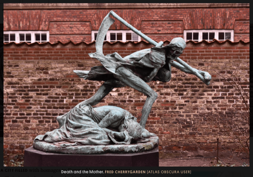 This deceptively trite story grows in existential dread as you consider it. In 1892 the sculptor Niels Hansen Jacobsen did just that, coming up with a deeply horrifying maquette entitled Death and the Mother. Nine years later it was cast in bronze to stand in front of the Helligåndskirk in Copenhagen. But in 1966 the locals had it banished elsewhere for being “profoundly depressing”.