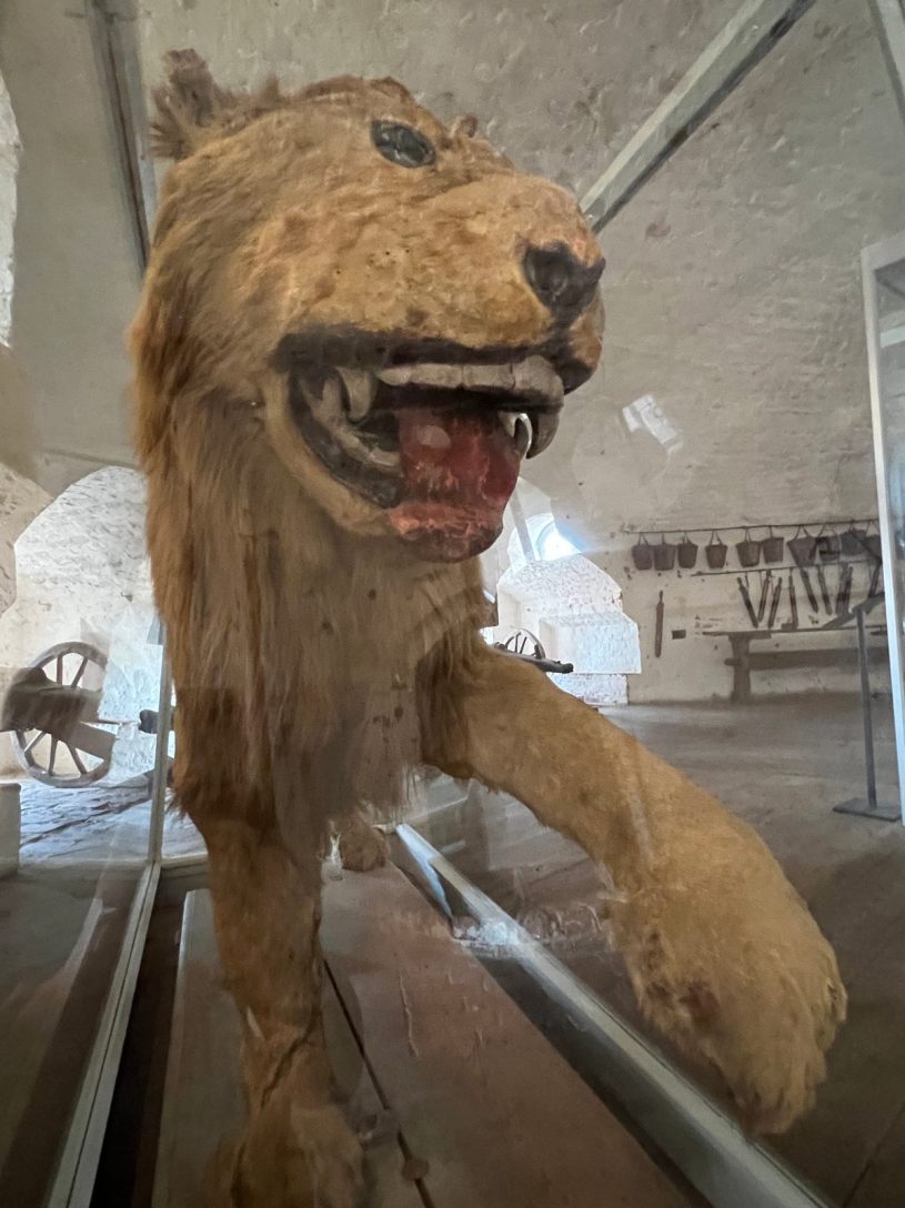 The lion may have arrived in Sweden alive, but the taxidermist who was given the dried-up pelt and bones to mount had never seen a proper lion. He did his best from heraldic representations.